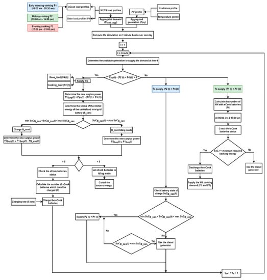Figure 3 illustrates the principles of operation for the central controller and the eCook battery charge controller algorithms, which were developed in MATLAB. These can be summarized in the following steps: