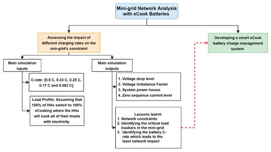 The network studies in this paper aim to give a clearer idea of the technical challenges when connecting eCook supported batteries to the hybrid PV/diesel mini-grid network. Charging the eCook batteries with a high C-rate causes increases in voltage drop and VUF that exceed the allowed limit of 5% and 2%, respectively. This is mainly observed in the case of the load busbars furthest from the power source. Therefore, an innovative smart EBMS has been developed to allow C-rate adjustments to engage in voltage regulation, which operates by constantly verifying the voltage drop at each phase, as well as the VUF level. In general, the results show that the proposed EBMS can ensure that the network operates within voltage constraints. Moreover, the EBMS offers other significant advantages. First, it enables a combination of slow and fast charging that allows a greater battery charge coverage across the network, ensuring that eCook devices are ready for use in the evenings. Secondly, it provides the best QoS compared to a network without EBMS; thirdly, this approach could be used in the future, in concert with other flexible and non-flexible high-power appliances, to facilitate their uptake. However, further studies are required to evaluate the suitability and generality of the EBMS strategy presented here on different mini-grid models of different scales and topologies. Further work will also consider the optimization of the C-rate, to maximize eCook penetration over different mini-grid types and topologies.