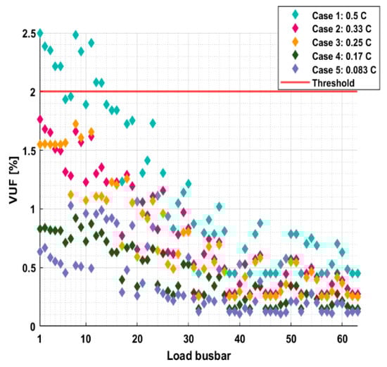Figure 5 illustrates the maximum VUF level throughout the simulation at each load busbar of the residential feeder; in the x-axis, the busbars are arranged in descending order with reference to their distance. The results show that the level of the C-rate has a significant impact on the performance of the grid. At a high C-rate (case 1, case 2 and case 3), the network experiences more stress at the load busbars that are far from the power source, particularly those busbars at the end of the feeder connected to HHs with eCook batteries. The VUF goes beyond the allowed limit of 2% for case 1, due to the unequal distribution of these batteries along the distribution line, where each phase experiences different voltage drops.