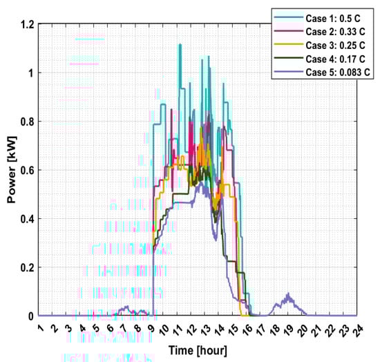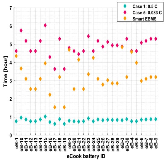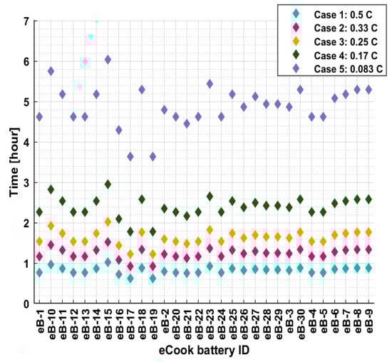 The simulation results show that over a typical day, the network experiences excessive voltage drops at phases A, B and C in case 1, case 2 and case 3 (Table 3). However, it also shows that this can be avoided by using a low C-rate, as indicated in case 4 and case 5. Naturally, the trade-off here is a longer charging period, as illustrated in Figure 12, which demonstrates the charging time for 30 eCook batteries, connected to the mini-grid, out of a total of 47. From the results, the average charging time in case 5 (4.65 h) increases by approximately six times the average charging time of case 1 (0.79 h); therefore, it is evident that a high C-rate reduces the charging time, but it does not present a better solution from the perspective of the network’s constraints.