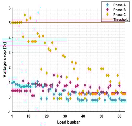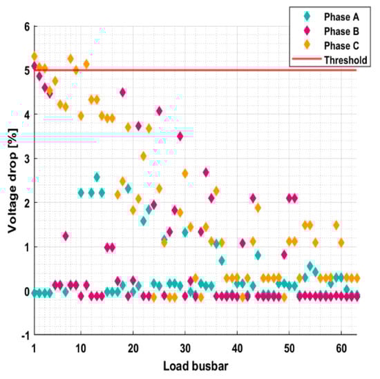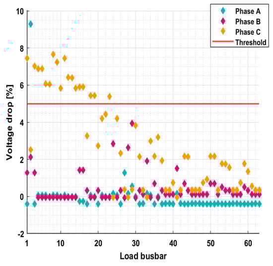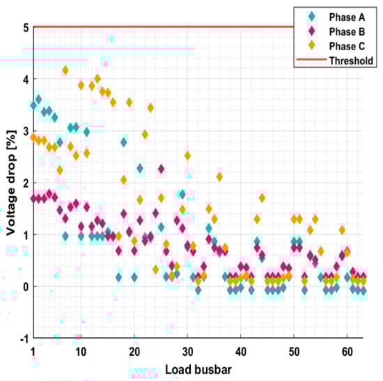 The load busbars’ voltage drop (%), obtained at maximum VUF for case 3 (0.25 C).