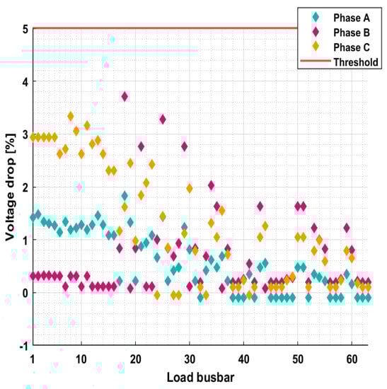 The load busbars’ voltage drop (%), obtained at maximum VUF for case 4 (0.17 C).