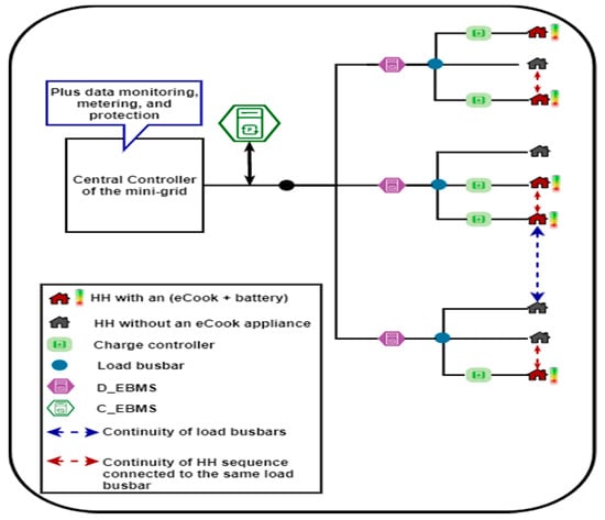 A simplified diagram showing the mini-grid components, including the two EBMS types (D_EBMS and C_EBMS).