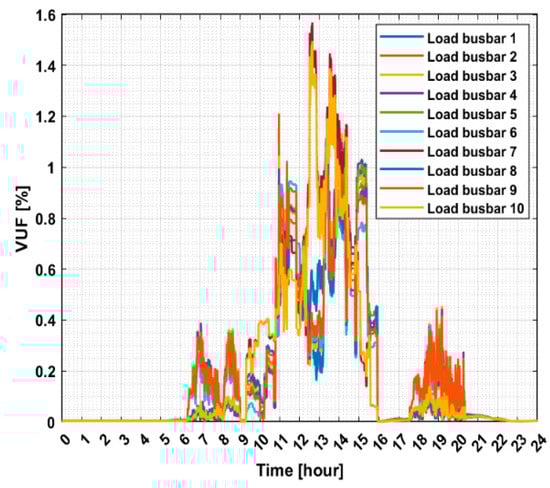 The maximum VUF value that occurs throughout the daily network simulation at each load busbar.