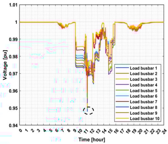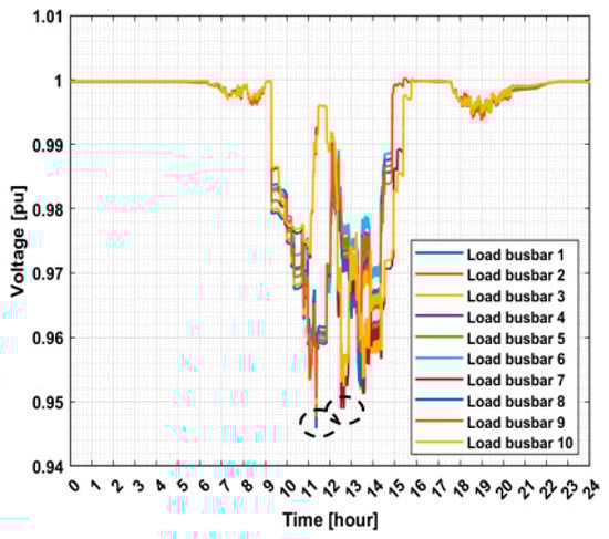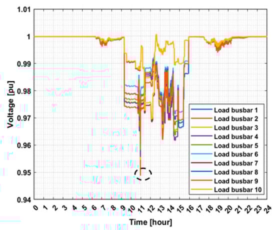 The voltage daily profile of phase A at load busbars from 1 to 10.