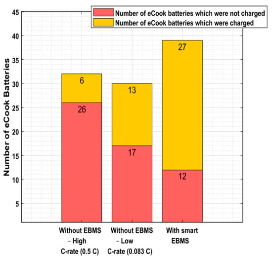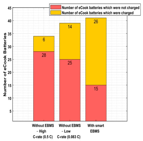 Connecting the eCook batteries significantly altered the network’s operation. This section of the paper presented this EBMS control strategy as a viable option, in accommodating higher and more distributed eCook demand along with these feeders, while ensuring that the VUF remains within the standard allowed limits. Another advantage of this approach is that a combination of slow and fast charging is permitted, resulting in successfully reducing the charging time, compared to case 5 (see Figure 19), which shows the charging time of 30 eCook batteries out of a total of 47), where the average charging time was reduced by approximately 62%. Using the EBMS also permitted an increase in the number of eCook batteries to be recharged on a cloudy day to meet the evening cooking needs, with a fraction of the batteries having enough charge to cook breakfast the following day, while on a sunny day, all 47 eCook batteries are charged enough to cook both meals (dinner and breakfast). On both sunny and cloudy days, lunch demand is directly supplied from the PV/diesel, as well as from the centralized battery.