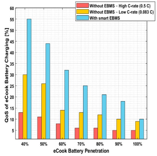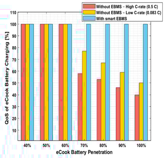 Up until this point, the EBMS performance was studied when connecting only 47 eCook batteries to the mini-grid (where 43% of HHs had an eCook battery), yet it is important to evaluate the maximum eCook battery penetration that could be connected to the type and size of the mini-grid studied in this paper. Figure 23 and Figure 24 present the QoS of eCook battery-charging as a percentage, showing the eCook battery penetration for sunny and cloudy days, respectively. The eCook penetration is gradually increased from 40% to 100% (where 100% refers to all 108 HHs using an eCook battery) in each of these cases.