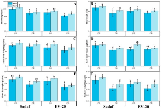 Effect of different levels of Si (0 and 6 mM) on shoot length (A), root length (B), shoot fresh weight (C), root fresh weight (D), shoot dry weight (E) and root dry weight (F) under the toxic concentration of Cd (500 µM) in the sand in both cultivars of Z. mays (Sadaf and EV-20). All the data represented were the average of three replications (n = 3). Error bars represent the standard deviation (SD) of three replicates. Different lowercase letters on the error bars indicate a significant difference between the treatments.