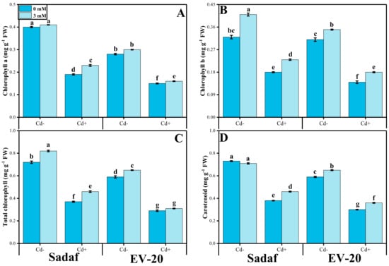 We also demonstrated various photosynthetic pigments in both cultivars (Sadaf and EV-20) of Z. mays grown under the toxic concentration of Cd (500 µM) in sand with or without the foliar application of Si (Figure 2; Table 2). Results showed that plants which were grown in the toxic amount of Cd in the sand significantly (p < 0.05) decreased chlorophyll a, chlorophyll b, total chlorophyll and carotenoid content in both cultivars of Z. mays compared with the plants grown in the control treatment. However, the results also advocated that Sadaf showed a greater concentration of photosynthetic pigments compared with EV-20 under the same level of stress in the sand. The concentrations of chlorophyll and carotenoid could be enhanced in both cultivars of Z. mays by the foliar application of Si which increased these pigments significantly even in the Cd-contaminated sand. Our results showed that the application of Si increased chlorophyll a, chlorophyll b, total chlorophyll and carotenoid contents by 0.026, 0.034, 0.31 and 0.06%, respectively, in Sadaf while also increasing by 0.03, 0.046, 0.42 and 0.08%, respectively, in EV-20 in the plants which were grown in sand containing the toxic concentration of Cd upon foliar application of Si (3 mM) compared with plants which were grown without the foliar application of Si.