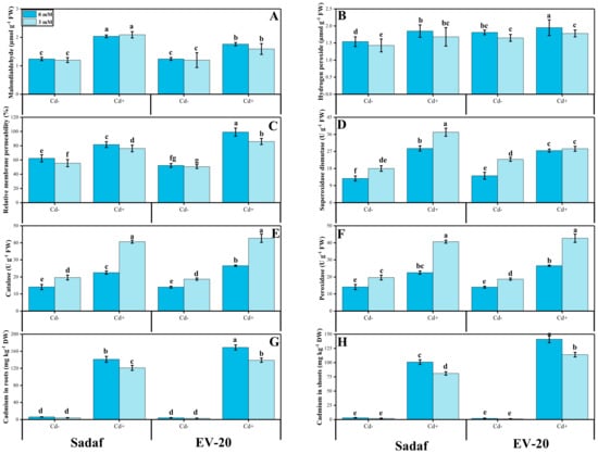 Effect of different levels of Si (0 and 6 mM) on malondialdehyde (A), hydrogen peroxide (B), relative membrane permeability (C), superoxide dismutase SOD (D), catalase CAT (E), peroxide POD (F), cadmium concentration in the roots (G) and cadmium concentration in the shoots (H) under the toxic concentration of Cd (500 µM) in the sand in both cultivars of Z. mays (Sadaf and EV-20). All the data represented are the average of three replications (n = 3). Error bars represent the standard deviation (SD) of three replicates. Different lowercase letters on the error bars indicate a significant difference between the treatments.