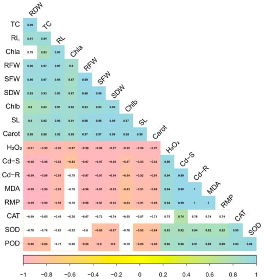 Pearson’s correlation between various morpho-physio-biochemical attributes of Z. mays cultivars grown under the application of Si in Cd-contaminated soil. Different abbreviations used in the figure are as follows: TC (total chlorophyll content), RL (root length), Chla (chlorophyll a content), RFW (root fresh weight), SFW (shoot fresh weight), SDW (shoot dry weight), Chlb (chlorophyll b content), SL (shoot length), Carot (carotenoid content), H2O2 (hydrogen peroxide content), Cd-S (cadmium concentration in the shoots), Cd-R (cadmium concentration in the roots), MDA (malondialdehyde content), RMP (relative membrane permeability), CAT (catalase activity), SOD (superoxidase activity) and POD (peroxidase activity).