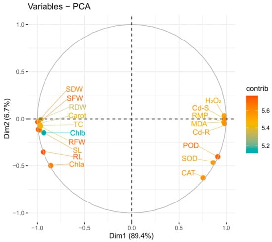 The loading plots of principal component analysis of Z. mays under the application of Si with or without the toxic concentration of Cd in the sand. Different abbreviations used in the figure are as follows: TC (total chlorophyll content), RL (root length), Chla (chlorophyll a content), RFW (root fresh weight), SFW (shoot fresh weight), SDW (shoot dry weight), Chlb (chlorophyll b content), SL (shoot length), Carot (carotenoid content), H2O2 (hydrogen peroxide content), Cd-S (cadmium concentration in the shoots), Cd-R (cadmium concentration in the roots), MDA (malondialdehyde content), RMP (relative membrane permeability), CAT (catalase activity), SOD (superoxidase activity) and POD (peroxidase activity).