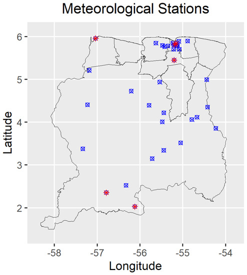 The Meteorological Service of Suriname provided the daily historical data for 35 stations from 1990 to 2019 (Figure 1). The analysis of this dataset was especially challenging, due to time series and data limitations. The data set from Suriname was used to calibrate the historical data provided by ERA5, which covers the entire country at a spatial resolution of 0.25° with temporal continuity, except for ERA5 wind observations, which could not be used.