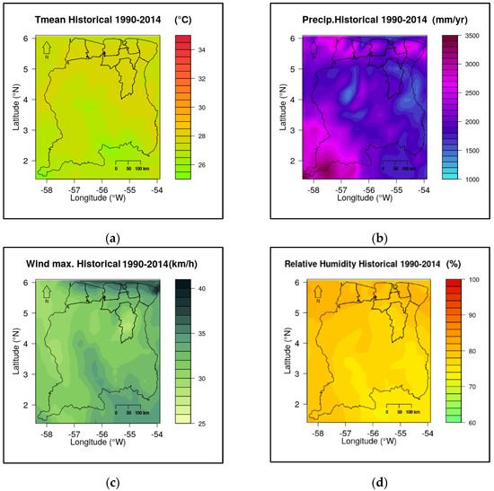 Reference period spatial distribution of: (a) mean temperature; (b) mean annual accumulated precipitation; (c) mean max wind values; (d) mean relative humidity.