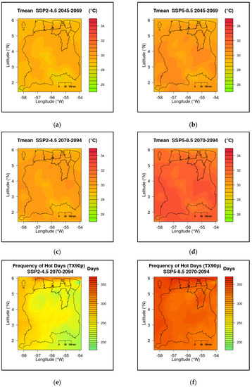 The most relevant results of this work regarding future climate scenarios for Suriname concern two main variables: temperature and rainfall. The rest of the variables (wind and relative humidity and their derived indices) show little or no change and are therefore of less interest.