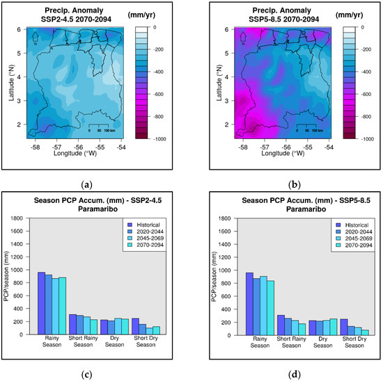 Results of spatial and seasonal precipitation projections: (a) Spatial distribution for the anomaly of projected mean accumulated rainfall for the long-term future under SSP2-4.5 scenario; (b) Spatial distribution for the anomaly of projected mean accumulated rainfall for long-term future under SSP5-8.5 scenario; (c) Projected accumulations for the SSP2-4.5 scenario for each of the Surinamese stations; (d) Projected accumulations for the SSP5-8.5 scenario for each station.