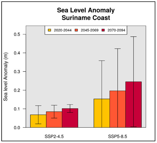 Climate projections were developed based on three climate models generated in the framework of the CMIP6. Based on these, the temperature is expected to increase throughout the country, for all regions and timeframes, reaching a warming of up to 6 °C in the southern region in the long-term future (2070–2094), particularly during the dry season and under the SSP5-8.5 scenario. Projections point towards a gradual reduction in precipitation, particularly in the southwest and coastal regions and under the SSP-8.5 scenario. The change in its annual distribution is also very relevant, as the dry season is expected to become wetter, and the rainy season is expected to become drier. The mean sea level is also expected to rise. However, different scenarios provide a very different climate forecast of this variable, so further research is necessary. These results are consistent with previous work in northern South America [38,39] and with results being shown globally, including the trend and acceleration of climate change [40] and its effects [41].