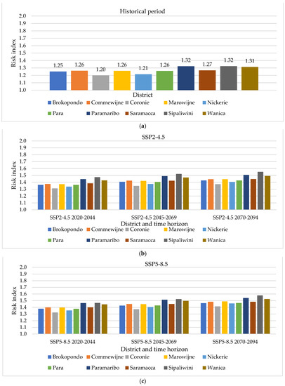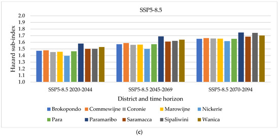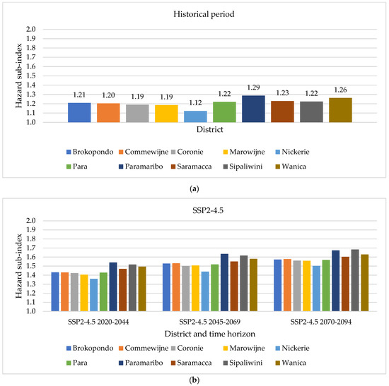 For the historical period, Paramaribo yielded the highest hazard sub-index, followed by Wanica. Nickerie, by far, scored the lowest (Figure 8a).