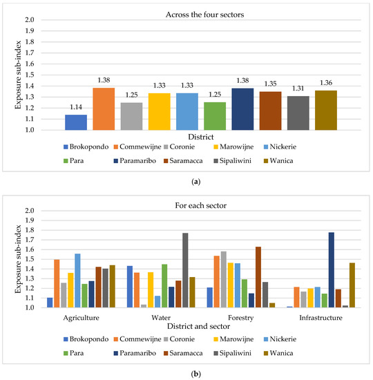 Results of the exposure sub-index for the ten districts (a) across the four sectors and (b) for each.
