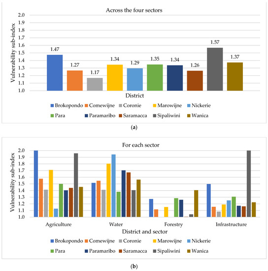 Results of the vulnerability sub-index for the ten districts (a) across the four sectors and (b) for each one of them.