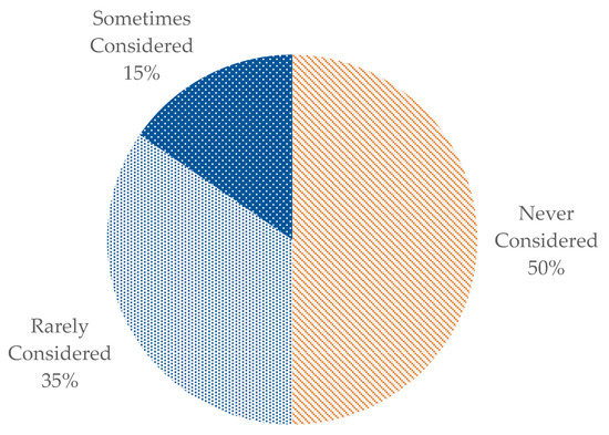 Specifically addressing the consideration of CAEV implementation in rural communities and on rural roads, Figure 1 shows the distribution of responses to the extent of consideration of CAEVs in rural transport planning. In comparison to the consideration of generalised developing transport technologies, consideration of CAEVs is less. Eighty-five percent of participants indicated that CAEVs are “never” or “rarely considered” in rural transport planning.