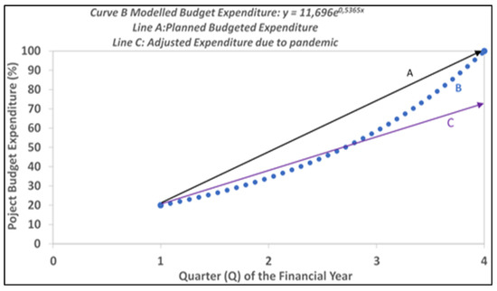 The results showed that 46% of research projects were negatively impacted (Figure 1), which reduced the total planned project budget expenditure (Lines A and C) by about 36% in Quarter 4 (Q4) of the financial year. The modelled budget expenditure (line B) indicates that research project progress might improve if the situation normalises in Q3. However, reports or deliverables to be submitted in Q3 should be work done in Q1 and Q2. Project performance and expenditure may not remarkably improve as predicted by line B, which implies that the Line C expenditure pattern may be indicating the reality about the 2020/21 Financial Year project performance and budget expenditure.