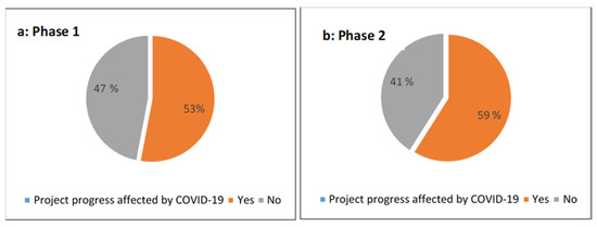 Results depicted in Figure 2a,b illustrate the responses from respondents regarding how project progress has been affected by the COVID-19 pandemic. During phase one of the surveys, more than half (53%) of the respondents stated that project progress had been affected by the lockdown due to the COVID-19 lockdown (Figure 2a). In addition, further analysis was done to compare whether there was a difference in project progress between phase 1 and phase 2 of data collection. The chi-square test results revealed no significant difference (p > 0.05) between responses, indicating that project progress was affected in both phases of the data collection process.
