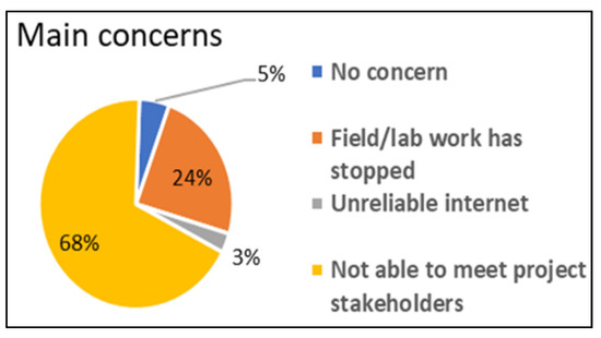 The respondents’ major concern regarding various projects was the inability to meet project stakeholders (68%) due to the stringent lockdown regulations (Figure 4). Additional concerns were field/lab work which had stopped (24%), no concern (5%), and unreliable internet (3%). As a result of these challenges, there was a need to realign some of the deliverable schedules, which caused delays in getting deliverables from the project leaders.