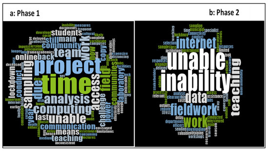 The word-cloud (Figure 6a) generated in NVivo illustrated that the major challenges associated with researching during the lockdown period were time, data analysis, and conducting sampling, especially in the laboratory. Teaching, working in teams, and access were also additional challenges mentioned by respondents. Access to the internet became imperative for students who could not meet their supervisors face to face and who relied on virtual meetings or other interventions to continue with supervision. The word-cloud in Figure 6b illustrates the main concerns that the research teams had during the COVID-19 pandemic: fieldwork, acquiring data, internet access, the teaching load, and the inability to access equipment and the laboratory during the lockdown period.
