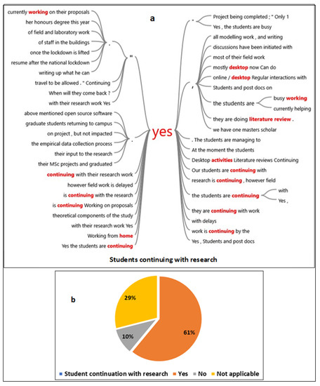 The results depicted in the word-tree (Figure 7a) conducted in the first phase of surveys indicate that most students continued with their work during the lockdown period, mainly through desktop activities such as working on proposals and writing literature reviews. Students who required various software for their projects utilised open-source software to conduct their work during the lockdown period and were, therefore not negatively affected in this regard. Results in Figure 7b show that most students (61%) continued their research during the lockdown period. Only 10% of respondents were unable to continue their research due to various challenges.