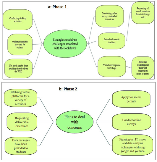 The mind map (Figure 8a) shows that respondents adopted various strategies to address the challenges associated with the lockdown during phase 1 of surveys. These strategies include virtual meetings and workshops, conducting online surveys instead of physical interviews, and requesting date extensions from the initial target date. There was also online guidance required for students, increased desktop activities, and the need to record workshops for those with connectivity issues who could not be present at workshops. The mind map in Figure 8b illustrates the various plans the research teams employed to deal with the concerns raised during the lockdown period in phase 2 of surveys. These include utilising virtual platforms for a variety of activities, applying for special permits for access to the field, and requesting deliverable extensions.