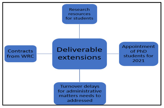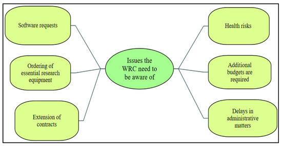 The mind map represented in Figure 10 shows the various challenges the WRC needed to be aware of. These issues included the requests for software, the ordering of essential equipment for research-related purposes, additional budgets for certain projects that were required, and the health risks associated with going into the field during this time.