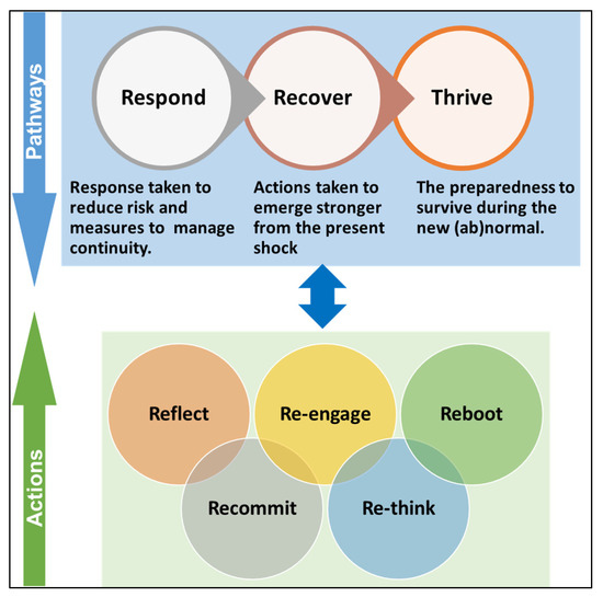 The WRC experiences facilitated the identification of three fundamental themes or pathways that organisations need to adopt from now onwards to reduce the risk of future shocks and enhance their resilience (Figure 11). These pathways include how organisations respond, recover, and thrive during a shock and after a shock [24]. Five critical actions drive the three pathways: reflect, recommit, re-engage, rethink, and reboot [24]. The actions form an important part of the recovery and response processes as they bridge response and the new (ab)normal.