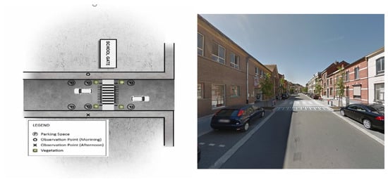 Left: Schematic description of road layout at two-way street school (Hasselt, Belgium). Right: Image of the street (Hasselt, Belgium).