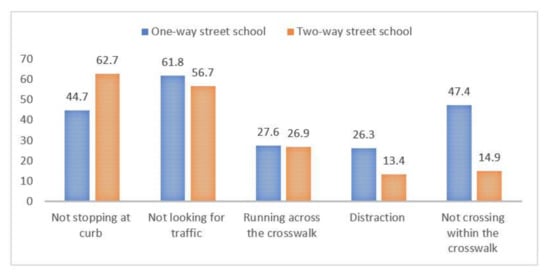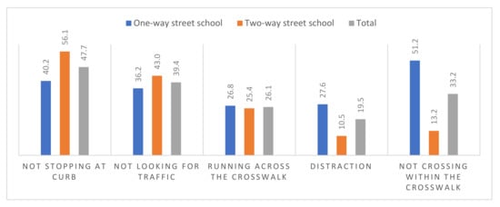 To cross safely, children need to prevent distracting activities that may lead them to not paying attention to critical environmental information and cross within the crosswalk lines [,]. Not stopping at the curb and observing the traffic is related to distraction and increases the risk of an accident [].