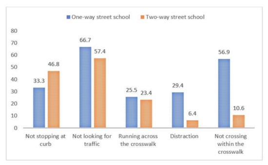 Around half the children were observed exhibiting two or more unsafe behaviours. Approximately one-fourth of the children were running or hopping while crossing the crosswalk, while one-fifth were distracted. Around forty percent of the children did not look for traffic while crossing, and almost half did not stop before crossing, which is less than the more than 60% observed by Zeedyk, Wallace []. The finding of children crossing in a straight line is in concordance with the results of a similar French study for accompanied children (supervised by adults), with two-thirds of the children staying within the lines of the crosswalk []. As regards not looking for traffic, one of the most prominent unsafe behaviours exhibited by children in the current study, these results are similar to behavioural observation studies on children, which identified not looking for traffic as the most prominent unsafe behaviour exhibited by children [,,]. As the age group observed are primary school children aged 6–12, there are some trends of dangerous behaviour across this age group, as shown by Rosenbloom et al. [], including that around half the children did not look for oncoming traffic within the age group of 7–11 year olds. A study on 5–6-year-old pedestrians [] has similar results, with only 40% looking for traffic. The finding makes it essential for children to be visible to the oncoming traffic as they are not looking for traffic themselves. The school near the one-way street had almost 80% wearing fluorescent vests, while the school near the two-way street had no children wearing any reflective jacket. One of the safety measures that children can take is to wear brightly coloured clothing to be conspicuous. This safety measure involves being seen by oncoming traffic and, most critically, by motorized vehicles []. The reflective vests worn by children can significantly increase children’s visibility to oncoming traffic, especially in winter months, to avoid accidents [].