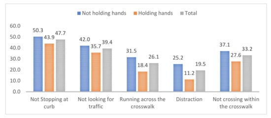 The accompanying adults’ behaviour was mainly safe, with only ten adults (4.1 percent) not looking for oncoming traffic, and 15 adults (6.2 percent) who were distracted while crossing. Adults not looking for traffic and being distracted resulted in more children significantly not stopping at the curb before crossing, χ2 (1) = 11.431, p = 0.001 and χ2 (1) = 4.207, p = 0.04, respectively. The risky behaviours were summed to create a “risky behaviour score” out of five. Ninety-eight adults were holding hands of the accompanying children (36.6% boys and 46.9% girls), while 143 did not. While checking the effect of this on children’s behaviour, significant differences were found between the two groups with the ones not holding hands performing significantly more risky behaviours, χ2(4) = 16.96, p = 0.002. Figure 6 presents the differences in behavioural indicators between children holding hands and not holding hands of the accompanying adult.