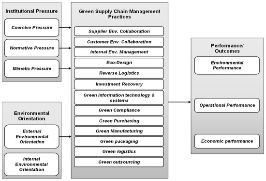 The engines of GSC initiatives have been explored through multiple perspectives. As far as its external drivers are concerned, the institutional theory and the relationship between institutional pressures and the GSC initiatives have been observed. To ensure that GSCM practices are being successfully implemented, several issues can be considered regarding the internal drivers. First of all, the senior management should be having a clear vision of the environmental policy [16,17]. Secondly, senior managers would be required to perform GSC initiatives [3,8,18]. Also, support from the middle managers is mandatory for stimulating GSC initiatives [14]. According to [19], the environmental orientation can be considered a resource if the firm wants to manage strategic practices, which depends on the resource-based view to enhance the company’s performance. The internal and external factors are considered critical determinants of corporate practices at the strategic level in terms of environmental strategies.