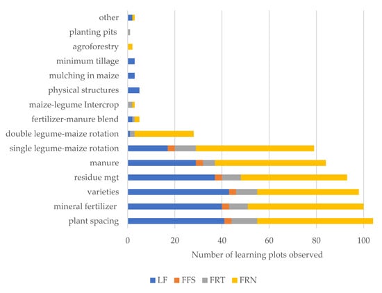 The layout of the learning plots in all the interventions followed a side-by-side comparison where sub-plots treated with distinct soil health innovations were compared (Table 4). There was a sub-plot treated with an option recommended by researchers and another with the current practice followed by the farmers in the community. Earlier in this section, it was indicated that most of the farmers in the FRNs had more sub-plots than farmers in other interventions. These additional plots had treatments that combined farmer knowledge and the recommendations from the researchers (adaptation). Other FRN farmers also added a sub-plot in which they tested their innovations. A few farmers involved in the Lead Farmer-, FRT- and FFS-based interventions worked on a single plot. In such cases, they compared a specific soil health option with practices applied in nearby fields within the village.