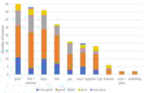 In all the interventions, farmers evaluated the different soil health options by observing the growth of the maize crop (i.e., maize response to soil health innovations). The results in Figure 3 show that whilst the majority of the farmers had favourable opinions towards the maize response to soil health options (very good and good), there were other farmers who felt that the options just performed reasonably or even poorly and very poorly. For example, out of the 45 farmers who evaluated groundnut/maize rotation for improving soil fertility and subsequent maize productivity, four indicated that it was a poor option. These unsatisfied farmers indicated that the maize from their plots had small cobs and ears.