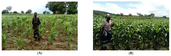 Maize response to groundnut rotation as a soil health option: (A) Male FRN farmer in poorly performing plot (Kaunda Village); (B) Female FRN farmer in well-performing plot (Kaunda Village). In both plots, maize was rotated with groundnuts, and both plots are in the same village.
