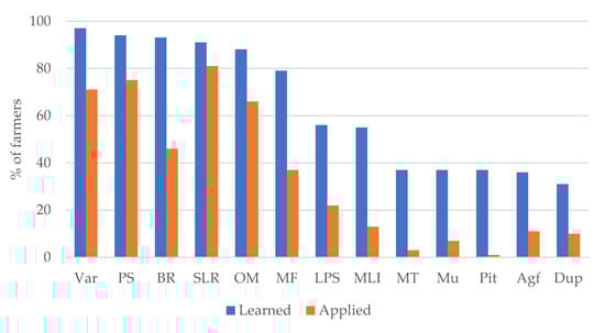 When farmers were asked to indicate the soil health options they had learned and applied in the main fields, results in Figure 5 show that farmers had acquired knowledge on a wide range of options. However, the proportions of farmers who indicated that they applied the options on their farms were less than the proportions who expressed having acquired knowledge through the interventions. Notably, significant gaps existed in options such as burying residues (47%), mineral fertilizer application and maize-legume intercropping (42%) as well as pit planting, land resources structures and minimum tillage (36%, 34% and 34%, respectively). Surprisingly, despite being new, around one-third of those few farmers who indicated having acquired knowledge about double-up legume had also applied the option in their fields. Observations in the fields revealed that only farmers in the FRNs and FRTs were applying the double-up legume option.