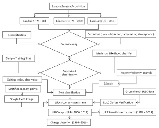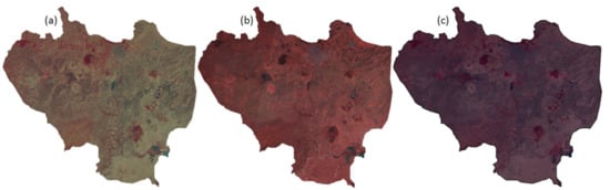 The Landsat TM, ETM+, and OLI images of 1984, 2000, and 2019 were selected, and GIS and IDRISI were used to analyze and process the changes in LULC, as shown in Figure 2. Remote-sensing image data of 1984, 2000, and 2019 were used, and atmospheric correction and radial calibration were performed. Relative geometric corrections were performed on the three images in order to remove geometric distortions caused by the Earth or sensor rotation [67]. Multi-temporal Landsat satellite imagery was used to analyze temporal and spatial changes to understand the dynamics of LULCs in the study area. Satellite imagery is geo-referenced using ground control points (GCPs) and projected using the Universal Transverse Mercator (UTM) system with WGS84 N 37 zones. In this study, false-color composite bands from Landsat images provided better visualization of surface features for further image processing (Figure 2).