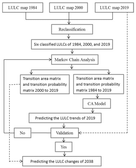 The scenario-driven CA–Markov model method was adopted and then calibrated and verified to simulate future LULC changes. Based on the Markov cellular automata model, the LULC changes were simulated under two different historical business-as-usual (BAU) scenarios. The images of 1984 and 2000 were used for the calibration and optimization of the Markov chain algorithm, and the images of 2019 were used to verify CA–Markov’s predictions [97]. The LULC change between two time periods (t1 and t2) was modeled using real-land-cover maps to predict the land-cover map at t3 and verify the model. We checked the simulated land-cover map (t3) against the real map [98]. In addition, the land-cover map in 1984 is the earliest image (t1), and the latest land-cover map in 2000 (t2) was used to simulate the projection map of 2019 (t3) and was checked against the real map in 2019. Compare the simulated LULC map with the actual map to verify the accuracy of the model. In order to predict the LULC maps in 2019 and 2038, the transition probability matrices for 1984–2000, 2000–2019, and 1984–2019 were calculated. The Markov and CA–Markov models were used to predict the LULC map in 2038.