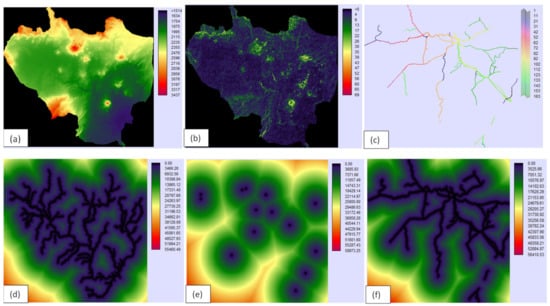Factor and constraint maps—elevation (a); slope (b); roads (c); distance to rivers (d); distance to urban areas (e); distance to roads (f).