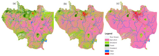 This study identified six LULC categories in 1984, 2000, and 2019, namely, agricultural land, forest, grassland, shrubland, water body, and urban. The area and relative change of the LULC category on the temporal scale are shown in Figure 8a,b. Temporal analysis of the LULC map of the basin shows that the accelerated development activities implemented have led to a complex and violent LULC transition.