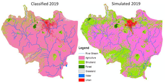 The LULC changes along the upper reaches of the Awash River are not uniform. In order to be able to use the CA–Markov model to simulate the future LULC in the upper reaches of the Awash River and validate the ability of the model, we first used the transition probabilities and the transition area between the LULCs of 1984–2019 to simulate the LULC in 2019 (Figure 7). Kappa variables were used to compare simulated and classified LULC in 2019. The simulation shows that the Kappa variation evaluation is as follows: 0.76 for , 0.88 for and 0.78 for , showing a high level of agreement. This shows the strength and reliability of the model in simulating future LULC changes in the upper reaches of the Awash River. In addition, visual analysis shows that the LULC category in the 2019 simulated LULC is more consistent with the 2019 classified LULC category. The calculated LULC change differences between the classified LULC and the simulated LULC in 2019 are shown in Table 5. The results show that the shrubland and urban areas were seriously overestimated, while the agricultural and grassland classification showed slightly lower results than the simulation. The calculated difference between the classified and simulated LULC shows that the agricultural, grassland, and water body categories are underestimated by approximately 28.06%, 26.65%, and 7.06%, respectively. On the other hand, the CA–Markov model proved to overestimate LULC categories, such as shrubland (222.23%), forest (23.50%), and urban (4.89%).