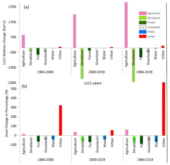 The LULC in (a) relative and (b) percentage (%) change between time periods (1984–2019).