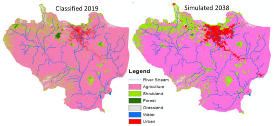LULC distribution in the upper stream of the Awash River basin for classified 2019 and simulated 2038.