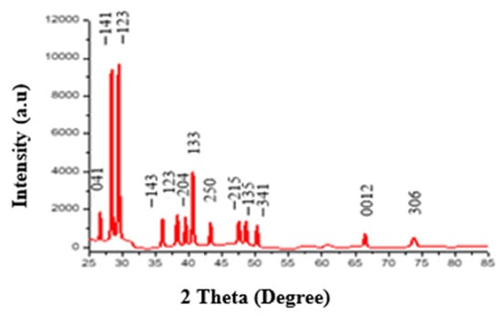 Biochars are frequently identified by measuring element concentrations in order to determine their potential as a nutrient. Identifying specific minerals and their abundance improves the understanding of element behavior. Powder X-ray diffraction (XRD) was used to identify minerals associated with pyrolysis residues to this end. Figure 1 depicts an XRD pattern of activated biochar made from banana waste and leaves. The mineralogical composition and mineral phases of banana-waste biochar were characterized by X-ray diffraction analysis. The mineral composition consisted of a long hump with such a centroid between 28 and 30 degrees, confirming the formation of the material of the main crystals. The major crystalline phase in the biochar was whewellite (Ca8.00C16.00O40.00H10.28), and the second phase was Calcite, syn CaCO3. Whewellite (a calcium oxalate mineral; prominent peaks at 2θ: 26.15°, 28.60°, 29.71°, 36.72°, 38.31°, 39.81°, 40.82°, 43.48°, 47.69°, 48.71°, and 50.51°) was found in biochar made from banana feedstock (Figure 1). Indeed, calcite was found in banana-waste biochar (peaks at 2θ: 65.59° and 73.72°). At a value of 2θ = 50.60°, whewellite structures vanished and were totally replaced by calcite.